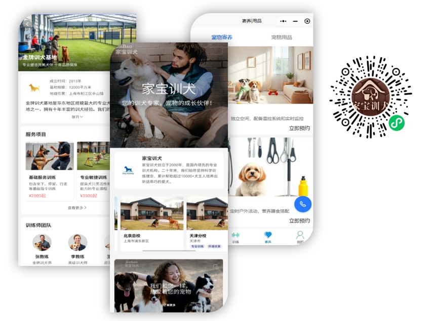 家宝训犬小程序是我们为专业训犬基地打造的品牌数字化解决方案。通过精美的视觉设计和流畅的用户体验,全方位展示训犬服务、课程体系和成功案例。小程序集成了在线预约、课程咨询、训练进度查询等功能,帮助客户拓展了线上获客渠道,提高了品牌知名度,同时解决了传统线下预约效率低、客户跟进难的问题,实现业务量提升30%以上。