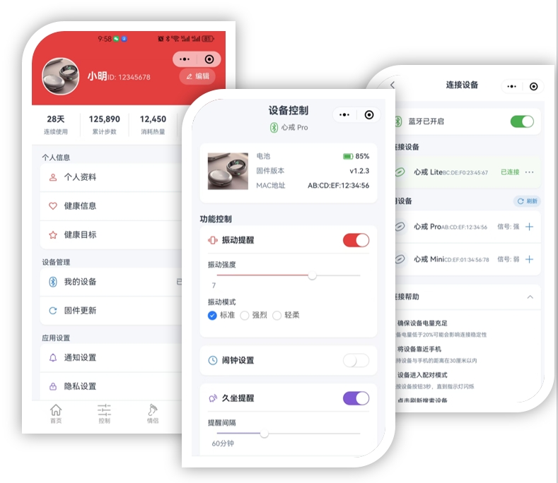 智能设备是当前科技发展主流趋势,我们通过软件与硬件深度融合,显著提升用户体验。采用小程序/APP通过蓝牙BLE技术连接智能设备,实现远程操作控制和实时数据采集,大幅提高产品附加值,增强用户黏性,为企业创造持续性收益。