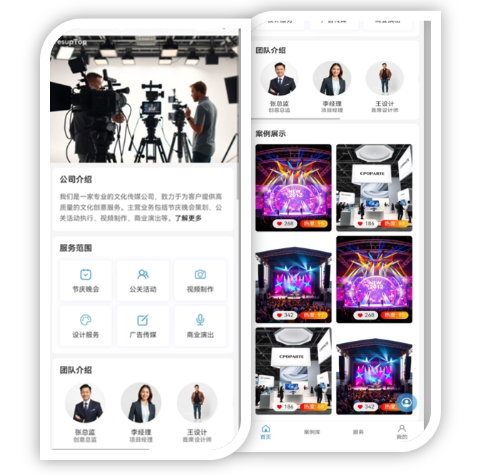 为文化娱乐企业量身定制的品牌展示小程序,集成公司简介、服务项目、团队介绍、成功案例、活动预约等功能于一体。通过精美的视觉设计和流畅的交互体验,全方位展示企业形象,提升品牌价值,让潜在客户随时随地了解企业服务,促进线上咨询转化为实际业务合作。